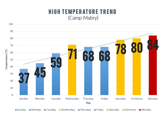 It goes without saying that it has been an unusually warm past several days across the area. Highs climbed into the upper 70s Christmas Eve, 80°F on Christmas Day, and a record-shattering 84°F yesterday. Check out the high temperature trend chart below. It's hard to believe a week ago we were coming off the heels of an Arctic Blast. That's winter in Texas for you!